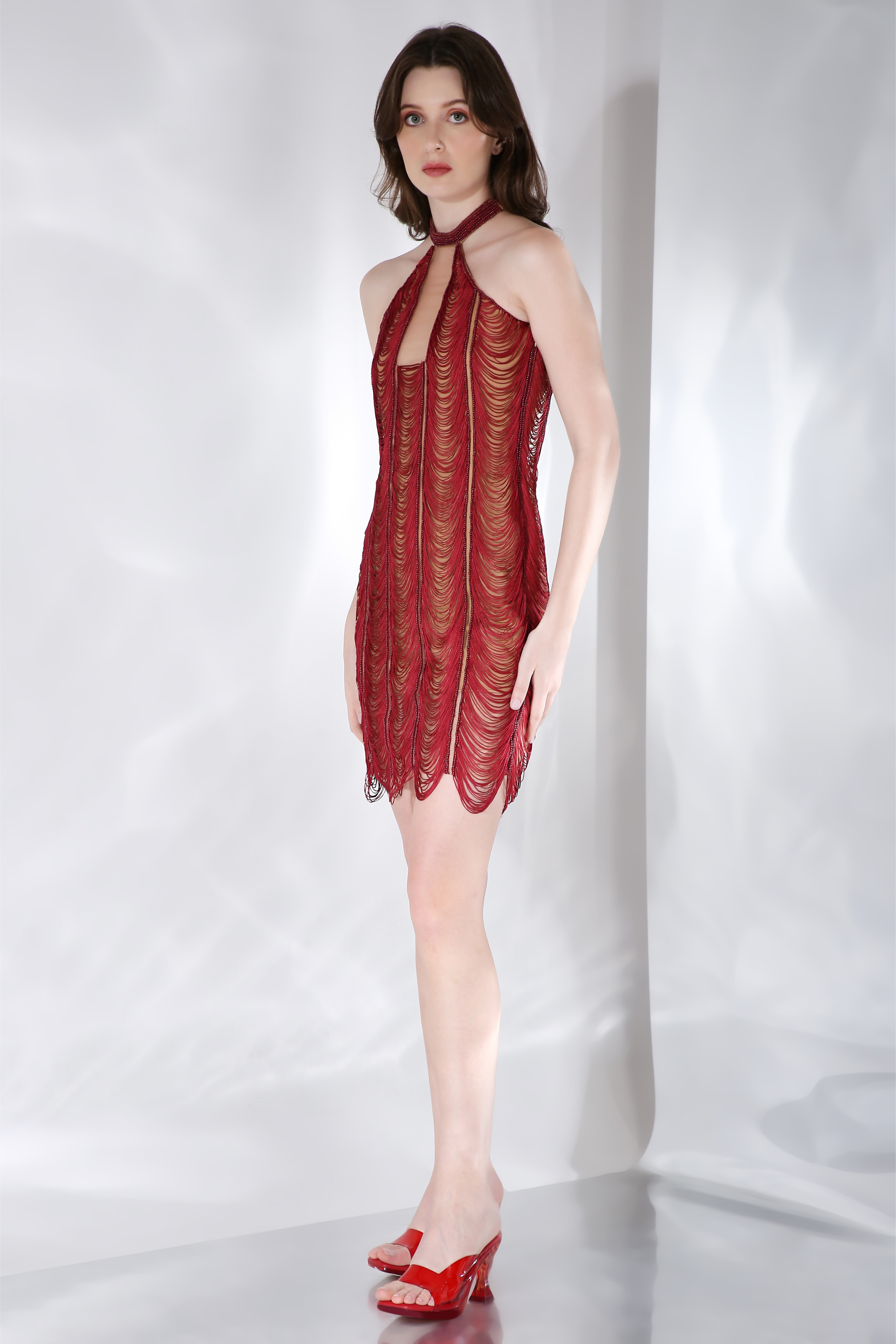 Featuring an intricate scalloped dress wherein each and every fringe is hand embroidered. The sheer play with skin coloured lining gives it an interesting look.
