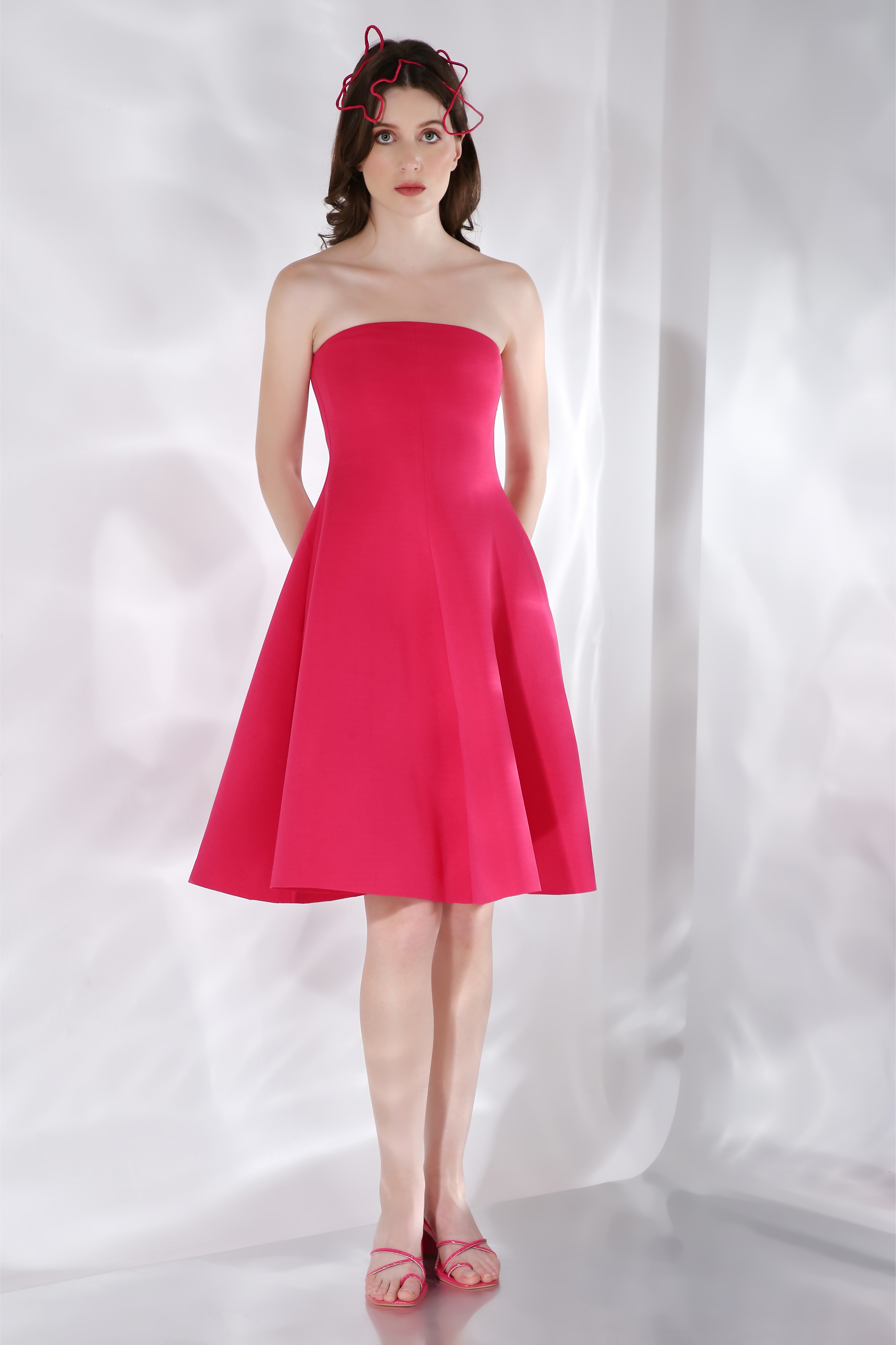 Featuring a flared knee length, strapless dress paired with a ruffled detachable accent which can be styled in different ways.