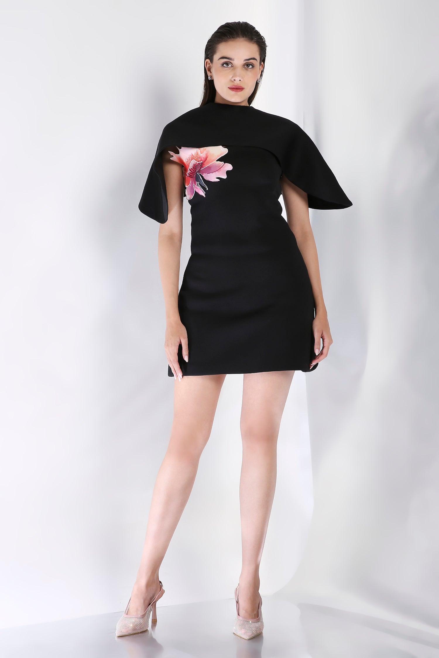 A masterclass in minimalism and detail, the Maeve Dress is crafted from sculpting neoprene in a sleek strapless silhouette. The focal point: a hand-patched and hand-embroidered floral applique that blooms across the neckline. Paired with a sculptural detachable shoulder wrap, it offers two distinct moods in one look—polished and powerful, or bare and bold.