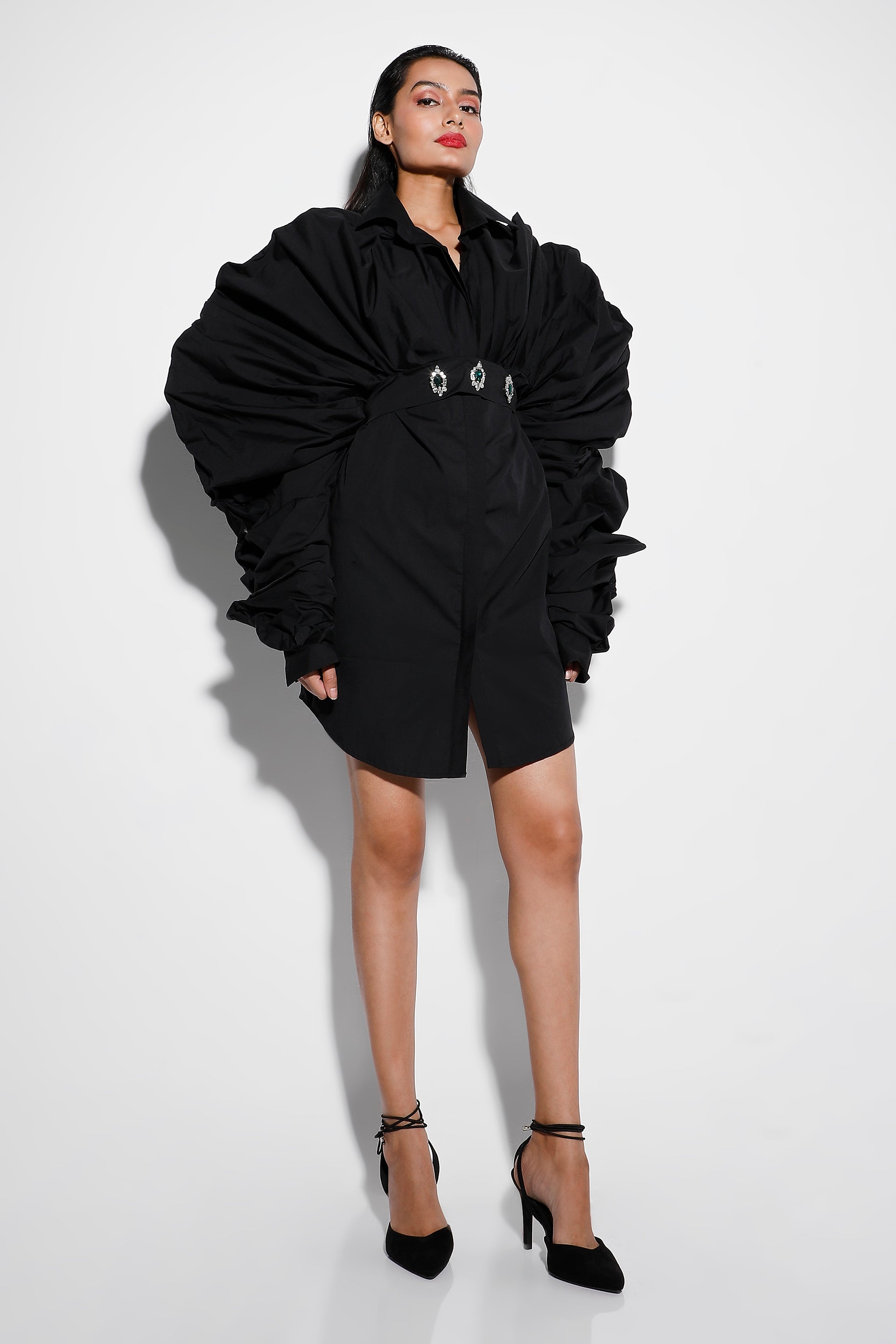 Featuring a solid, power look in our wired shirt dress Selena which comes with a studded, tie-up belt.