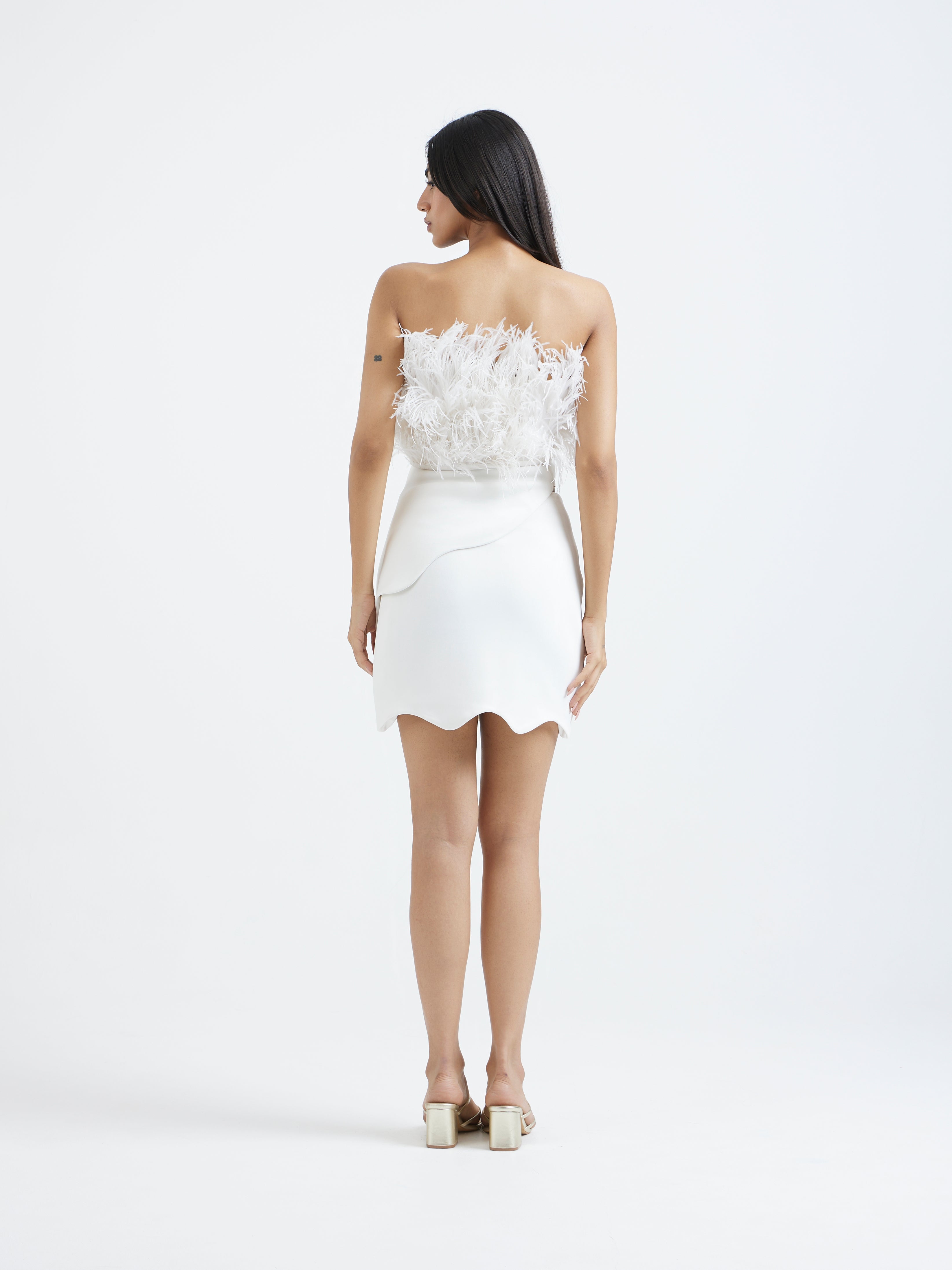 A sculpted scuba skirt and top set elevated with a dramatic, detachable feather tube wrap that adds instant couture softness. The clean, wave-hem mini skirt pairs with a sleek structured base, allowing the detachable feather wrap to take center stage.