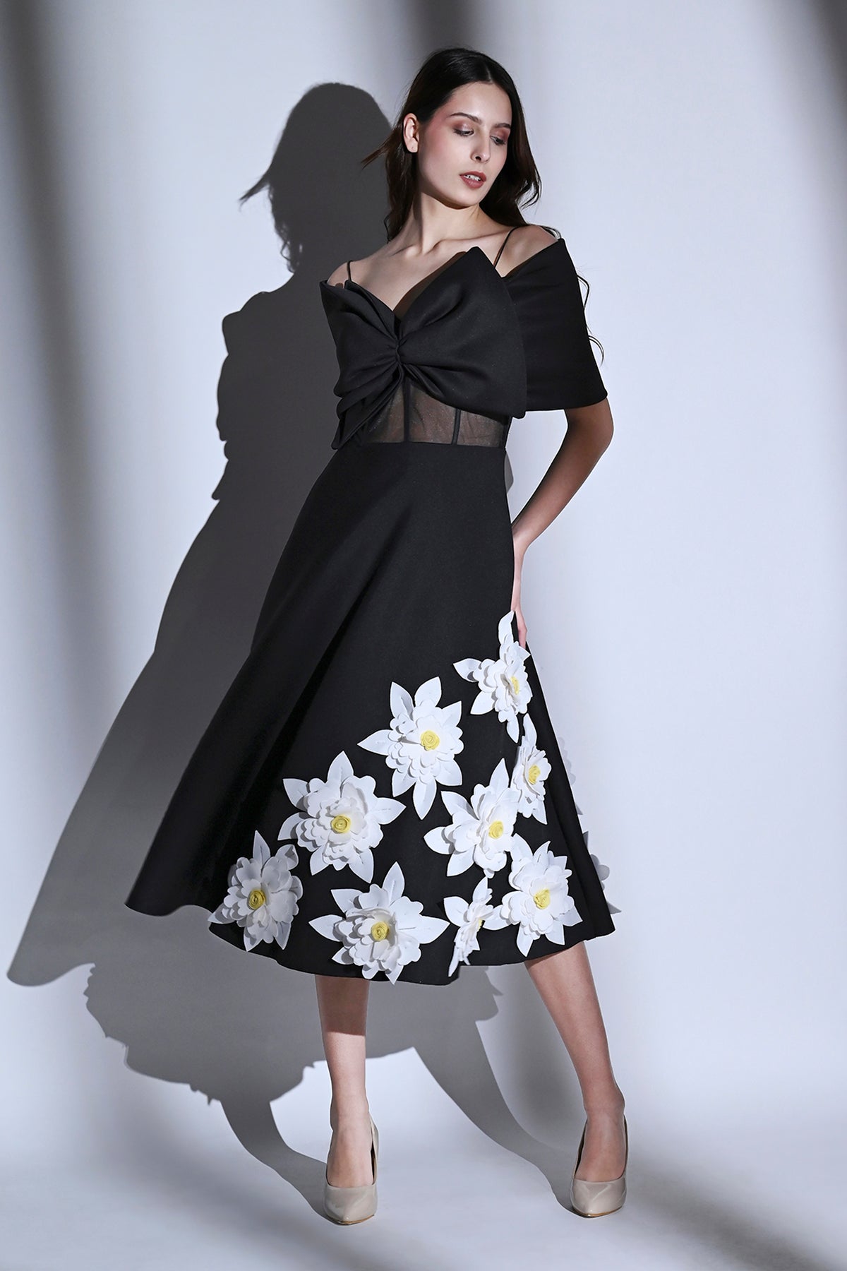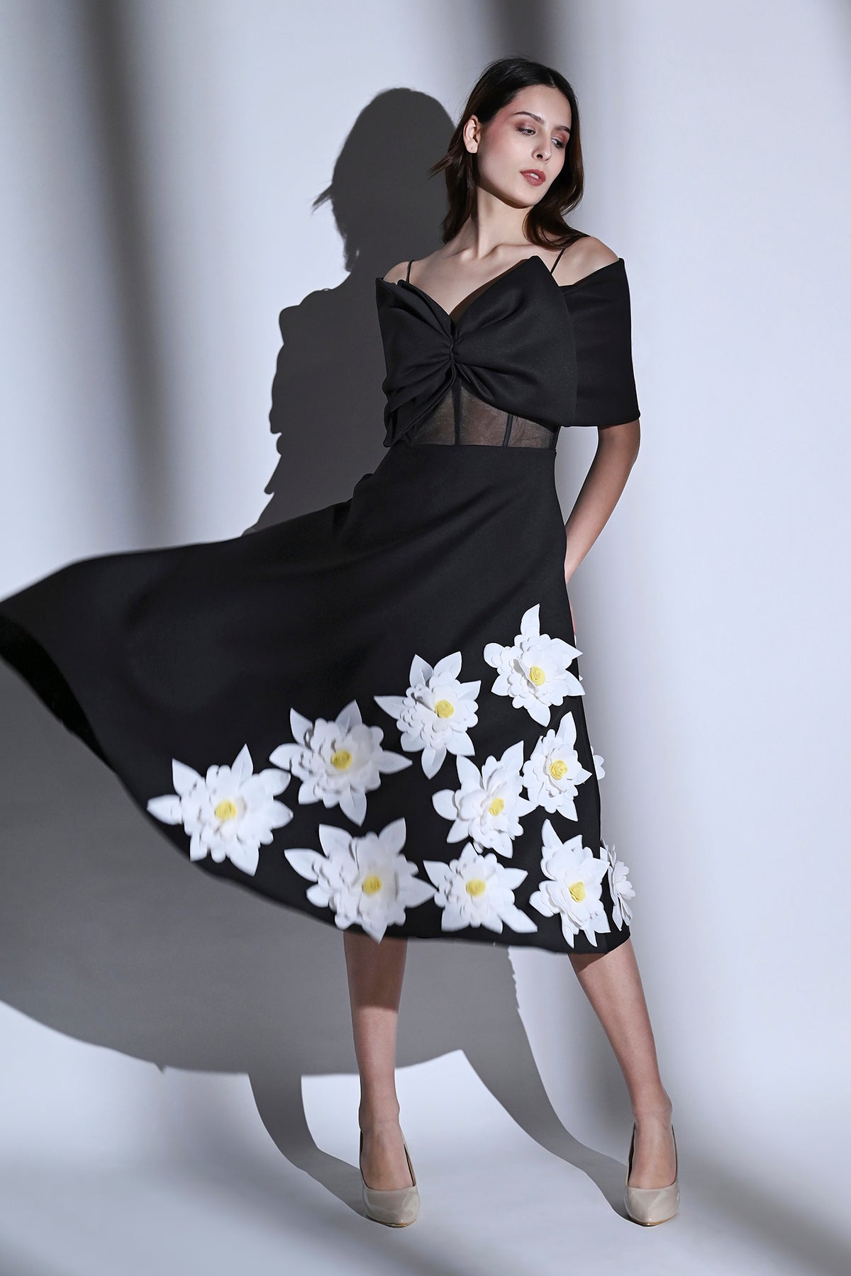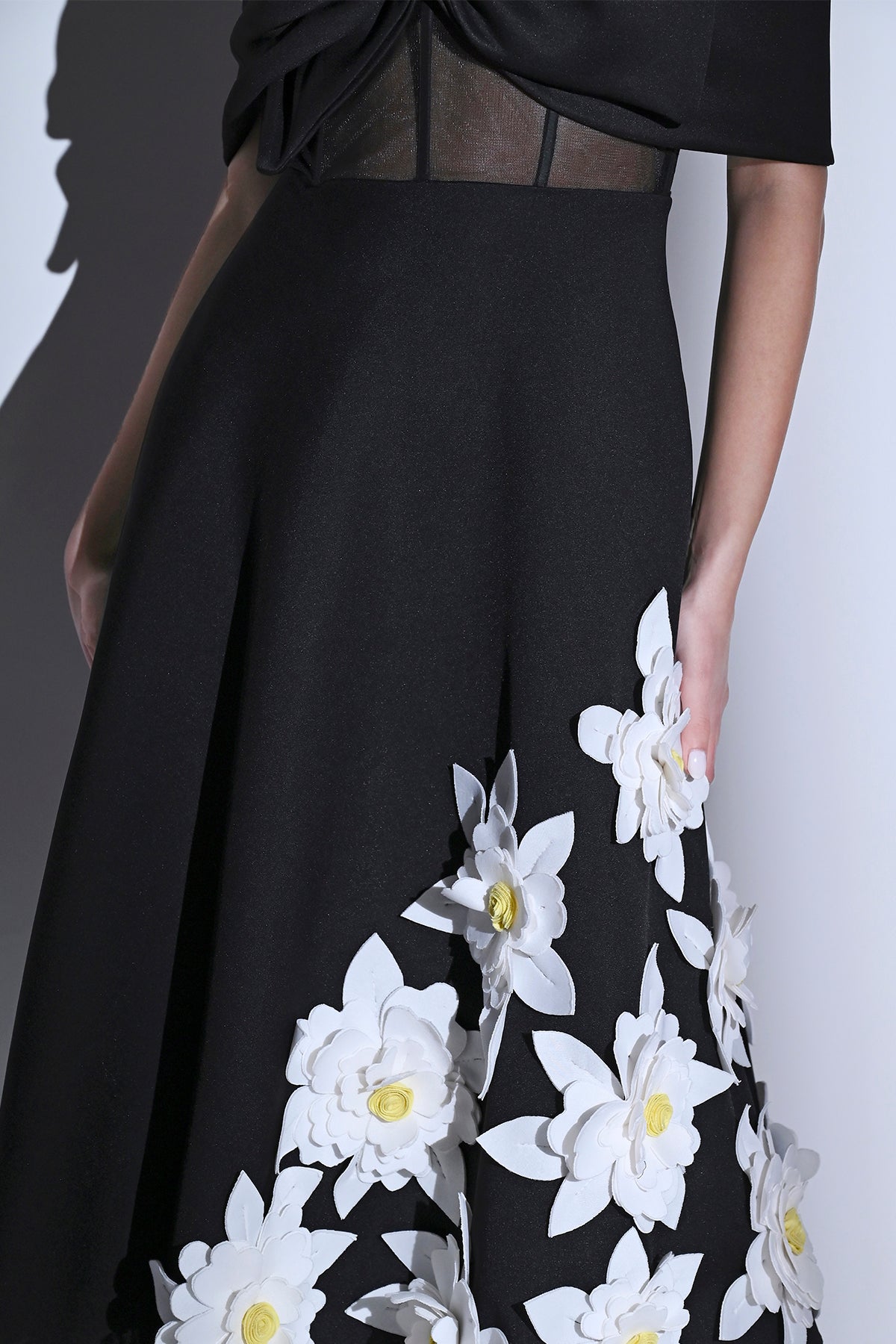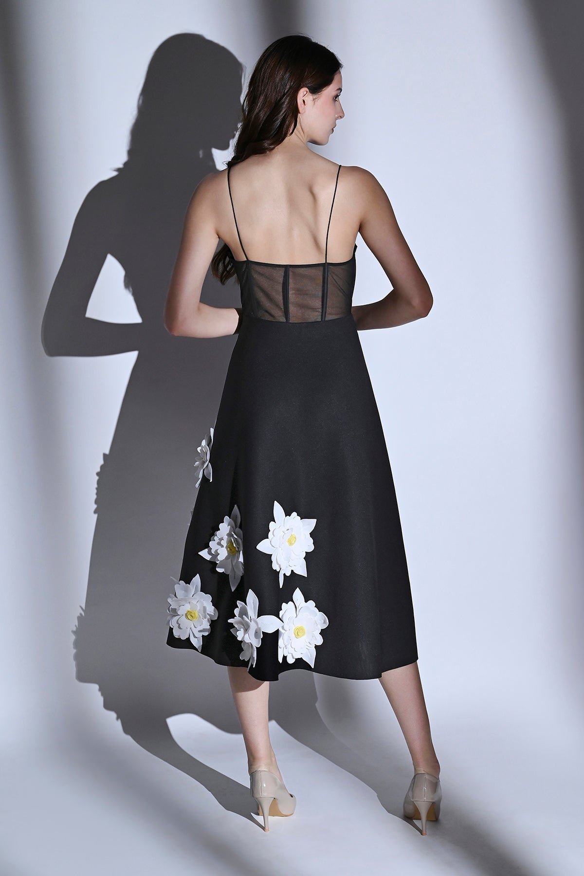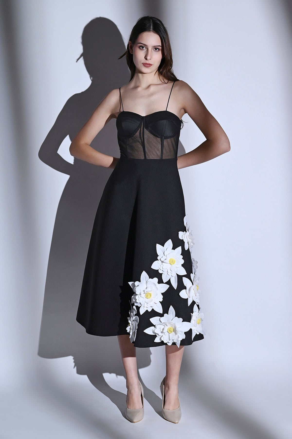 Featuring Aalika in Alyssa, a corseted fit and flare dress with 3D embroidered flowers. The bodice is sheer, with net detailing. The dress has a side zip closure.