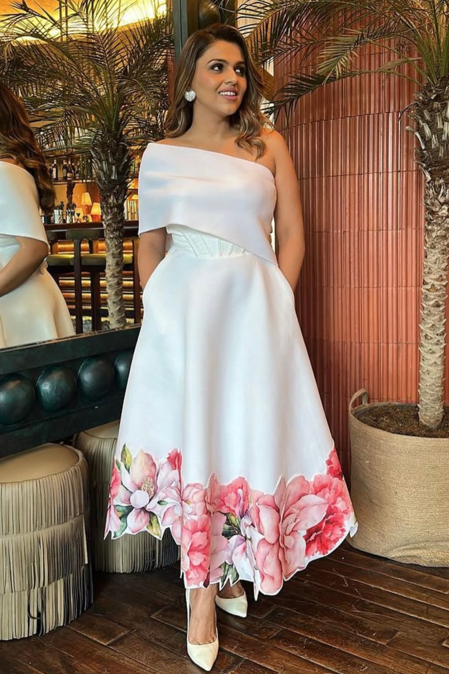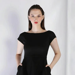 The fabric is thick and flows away from the body giving it a structured fall.