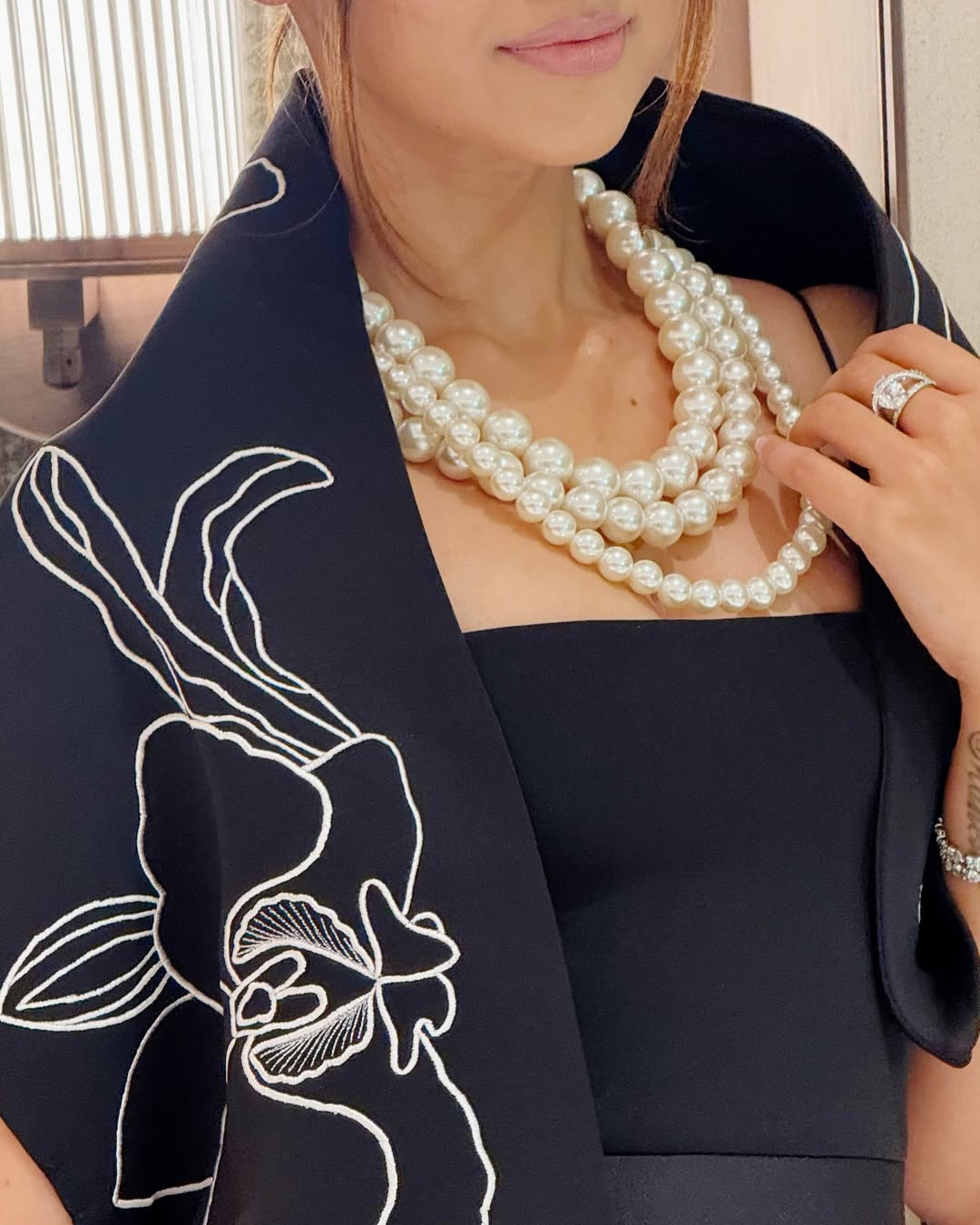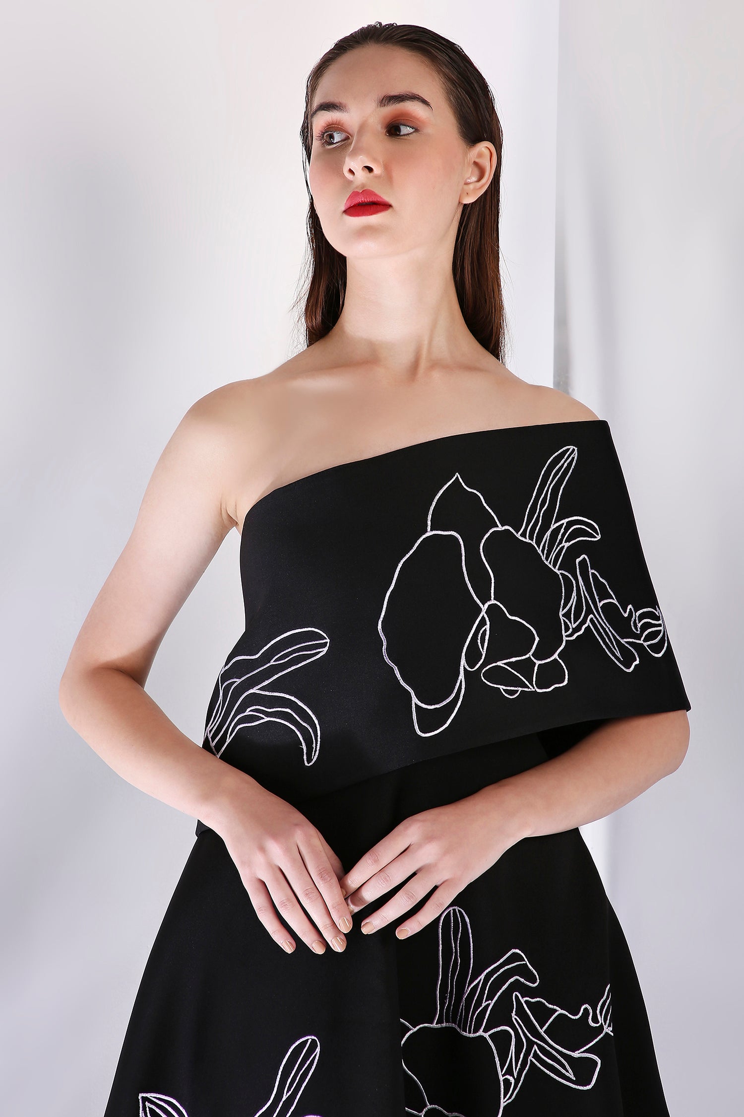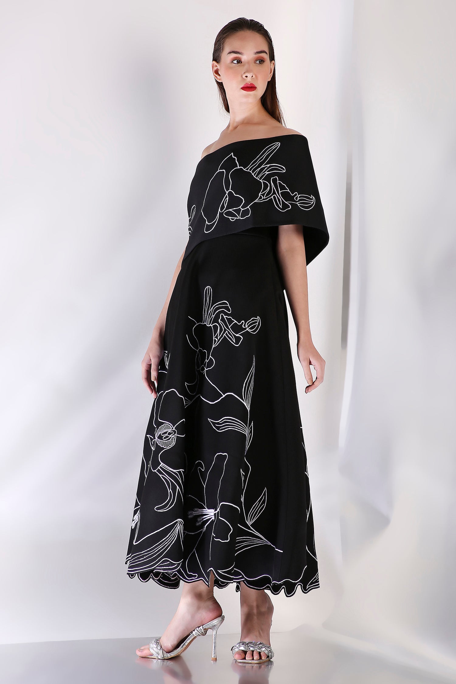 It comes paired with a versatile embroidered wrap, designed to be styled either one-shoulder or off-shoulder — letting you switch from classic to contemporary with ease.