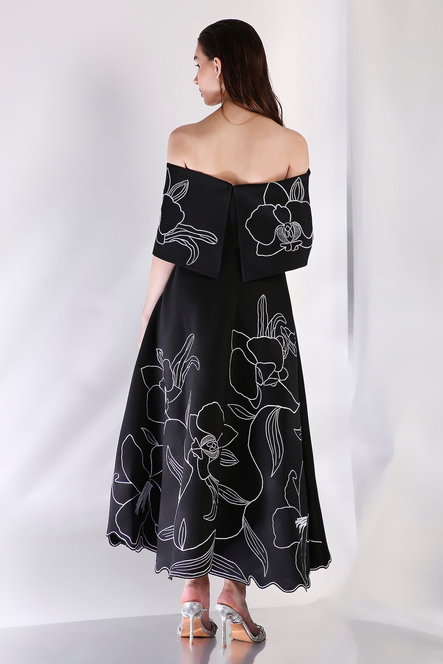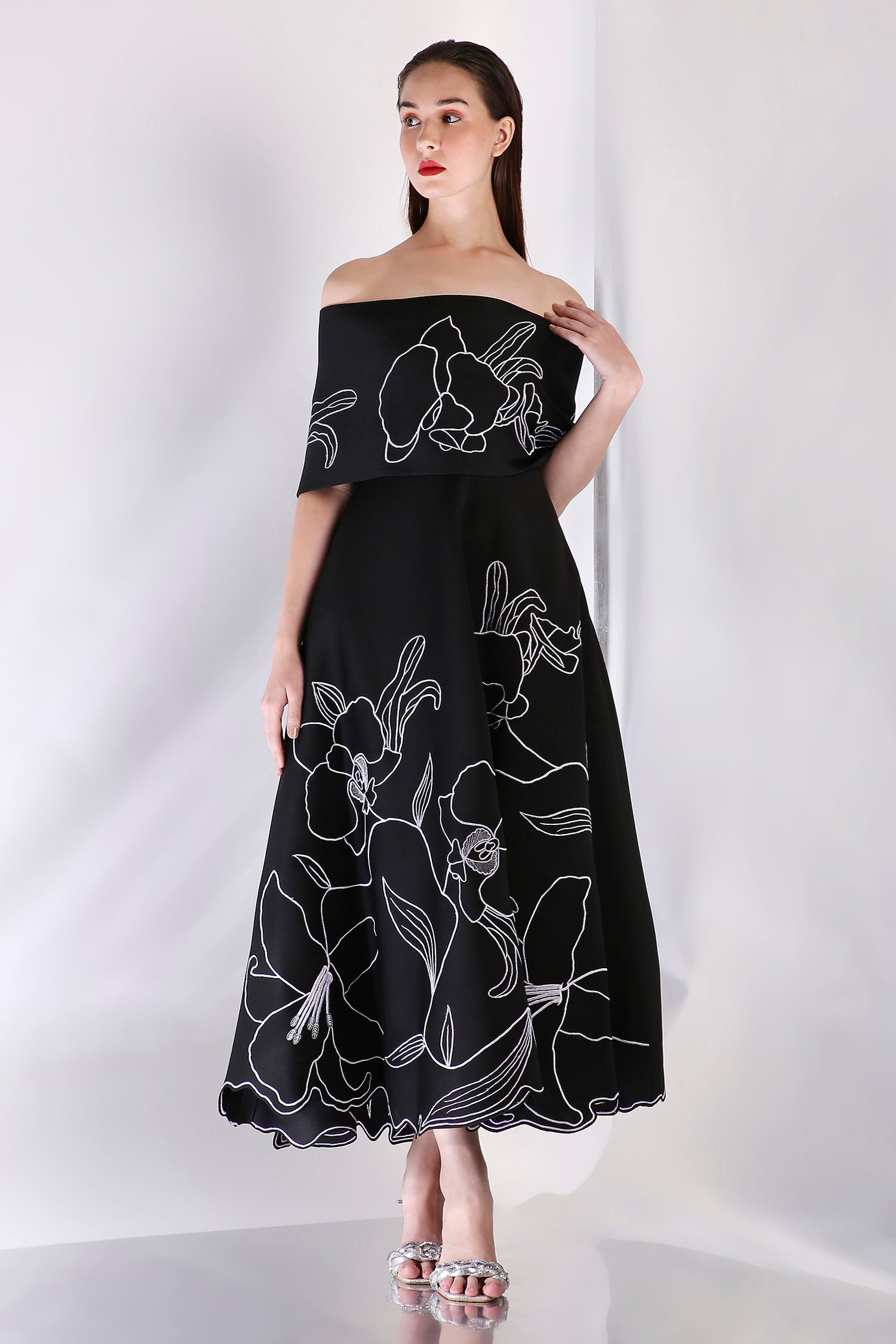 The Vero Dress is a strapless, mid-calf length fit-and-flare silhouette crafted in premium neoprene for a clean structure and fluid movement. Delicately embroidered floral motifs trail across the entire garment, adding texture and elegance in every detail.