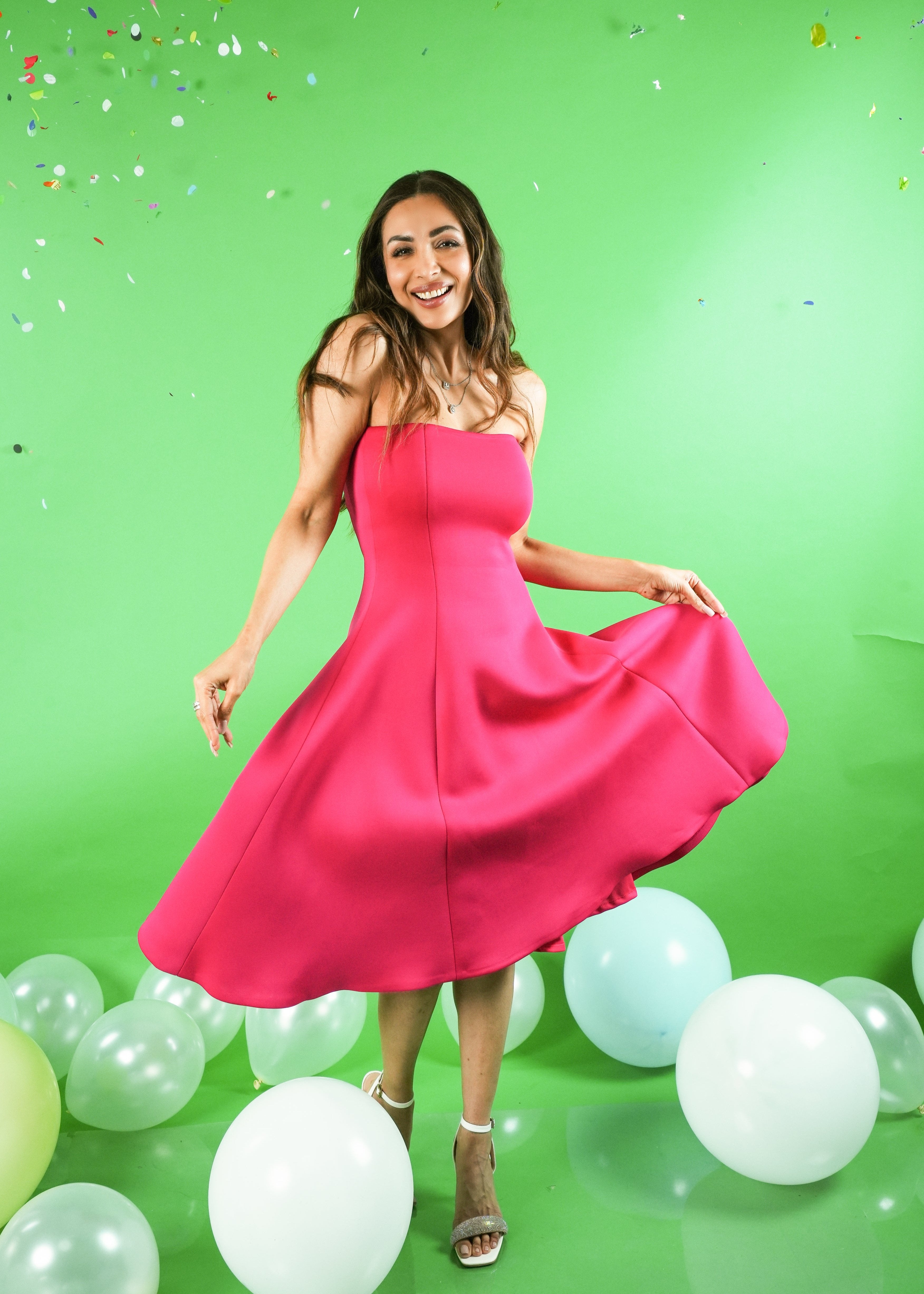 Featuring Malaika in a strapless dress with a structured flare.